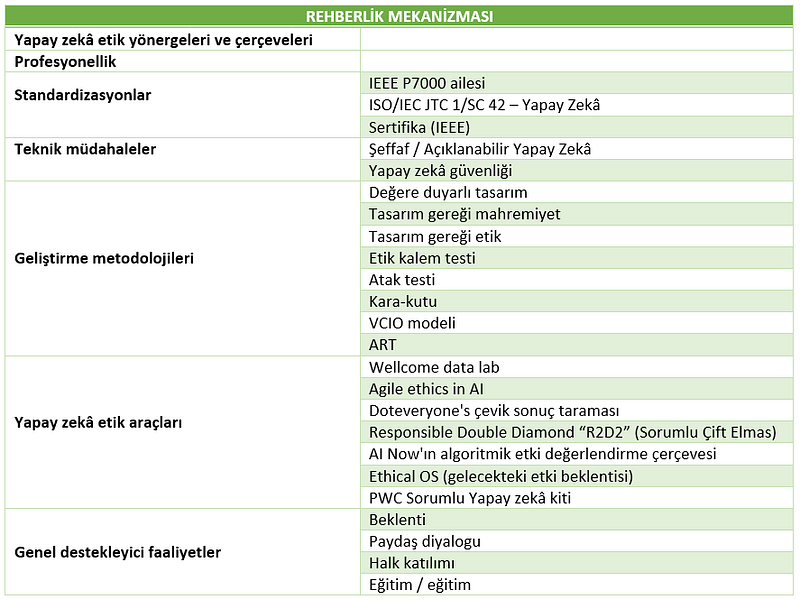 Yapay zekâ (YZ) dinamik bir ortamdır ve bu ortamda süreçleri etik şekilde yürütmek için bir takım rehberlik mekanizmalarına ihtiyaç duyulmaktadır. Bu şekilde bireyler ve/veya kuruluşların paydaşlığı ile etkin bir ortam oluşturulabilir.