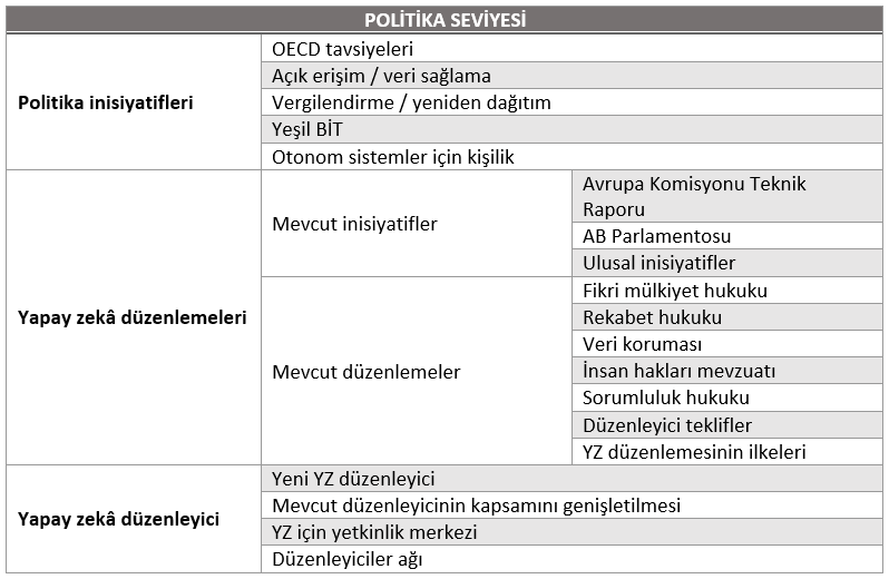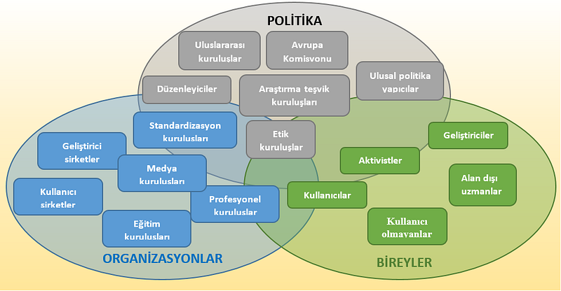 Şekildeki ilk paydaş kategorisi politika ile ilgilidir. Araştırma politikası ve teknoloji politikası dâhil olmak üzere YZ ile ilgili politikaları belirleyen, etik ve insan hakları konularının nasıl ele alınabileceğini şekillendirmede önemli bir role politika yapıcıları kapsamaktadır. Buna BM, OECD gibi uluslararası kuruluşlar ve UNESCO ve Uluslararası Telekomünikasyon Birliği (ITU) gibi yan kuruluşları dâhildir.