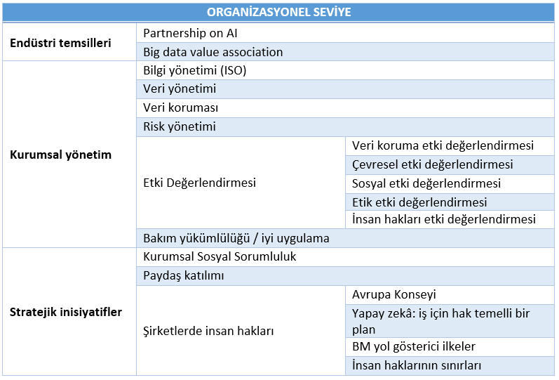 YZ alanında ticari kuruluşların yanı sıra YZ değer zincirine dâhil olan çok sayıda kuruluş, meslek örgütleri, standardizasyon kuruluşları ve eğitim kurumları vardır. Bunlar dahil edilmelidir. Çünkü standartların kullanımı, etik hususların standartlara entegrasyonu ve eğitim yoluyla farkındalık ve bilginin artırılması ile açık bir ilişkisi vardır. Benzer şekilde, medya kuruluşları etik konulara ilişkin farkındalığı artırmada ve kamu söylemini yönlendirmede çok önemli bir rol oynarlar. Bu durum politika geliştirmeyi teşvik edebilir.
